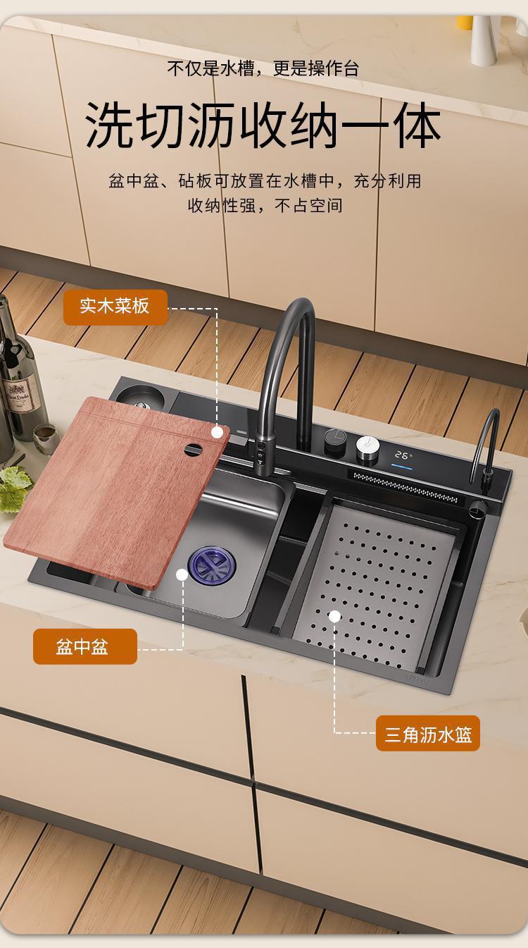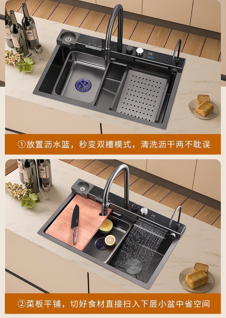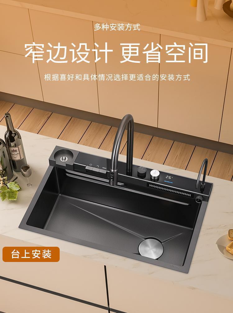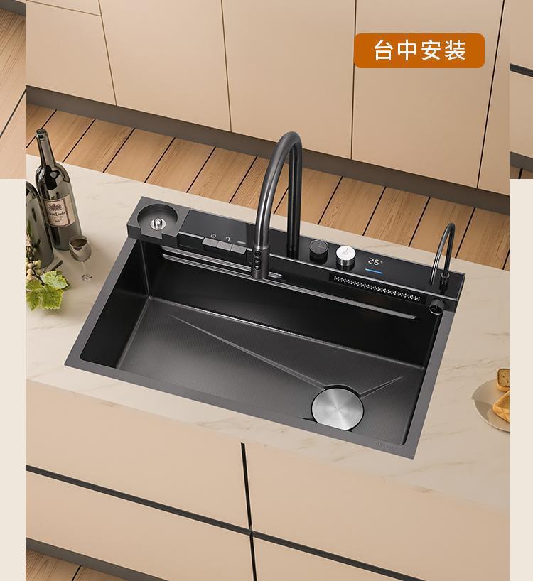 数显飞雨瀑布水槽单槽黑色加厚不锈钢纳米家用洗菜盆洗碗池大单槽