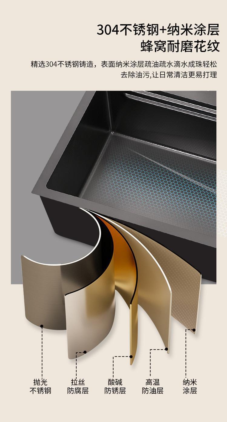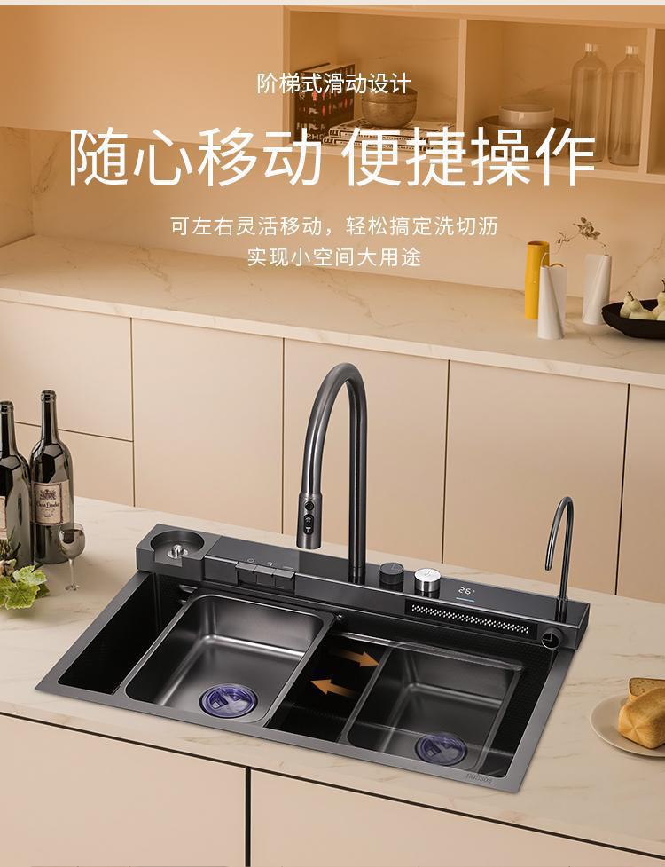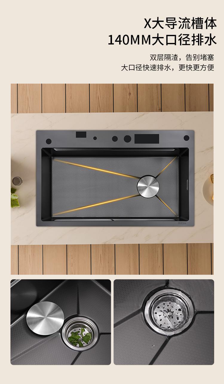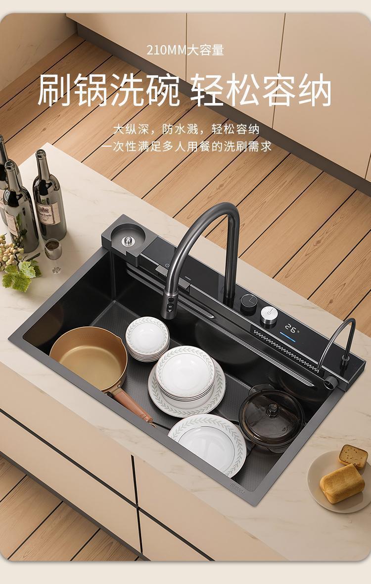数显飞雨瀑布水槽单槽黑色加厚不锈钢纳米家用洗菜盆洗碗池大单槽